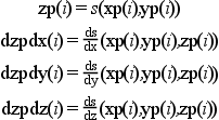 vectors (or matrices) of same format than xp, yp and zp, elementwise evaluation of the first derivatives of s on these points.