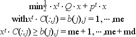[x,iact,iter,f]=qp_solve(Q,p,[C1 C2],[b1;b2],me)